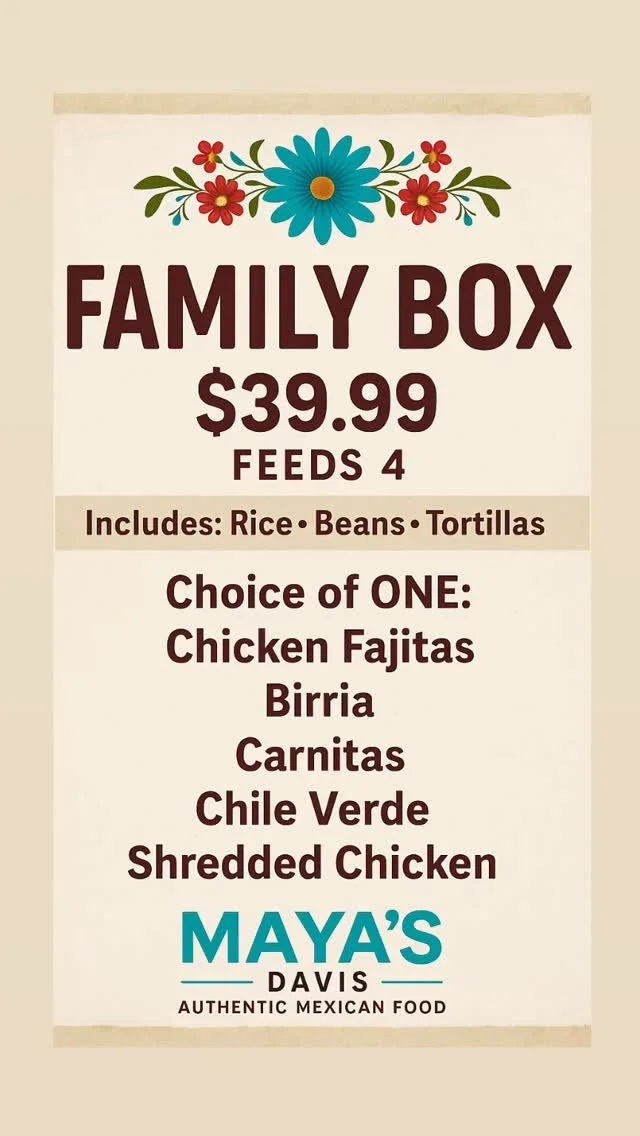 Today, Miguel has passed down that same work ethic and those same flavors to his own children. Maya’s Authentic Mexican Food in Davis, CA is proud to be the third location — a dream that began in that small kitchen in Guanajuato, now shared with our community.